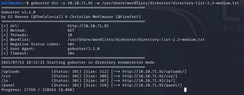 gobuster dir -u 10.10.71.92 -w /usr/share/wordlists/dirbuster/directory-list-2.3-medium.txt komutu ile ilgili web siteyi ait uzantıları aratılır.