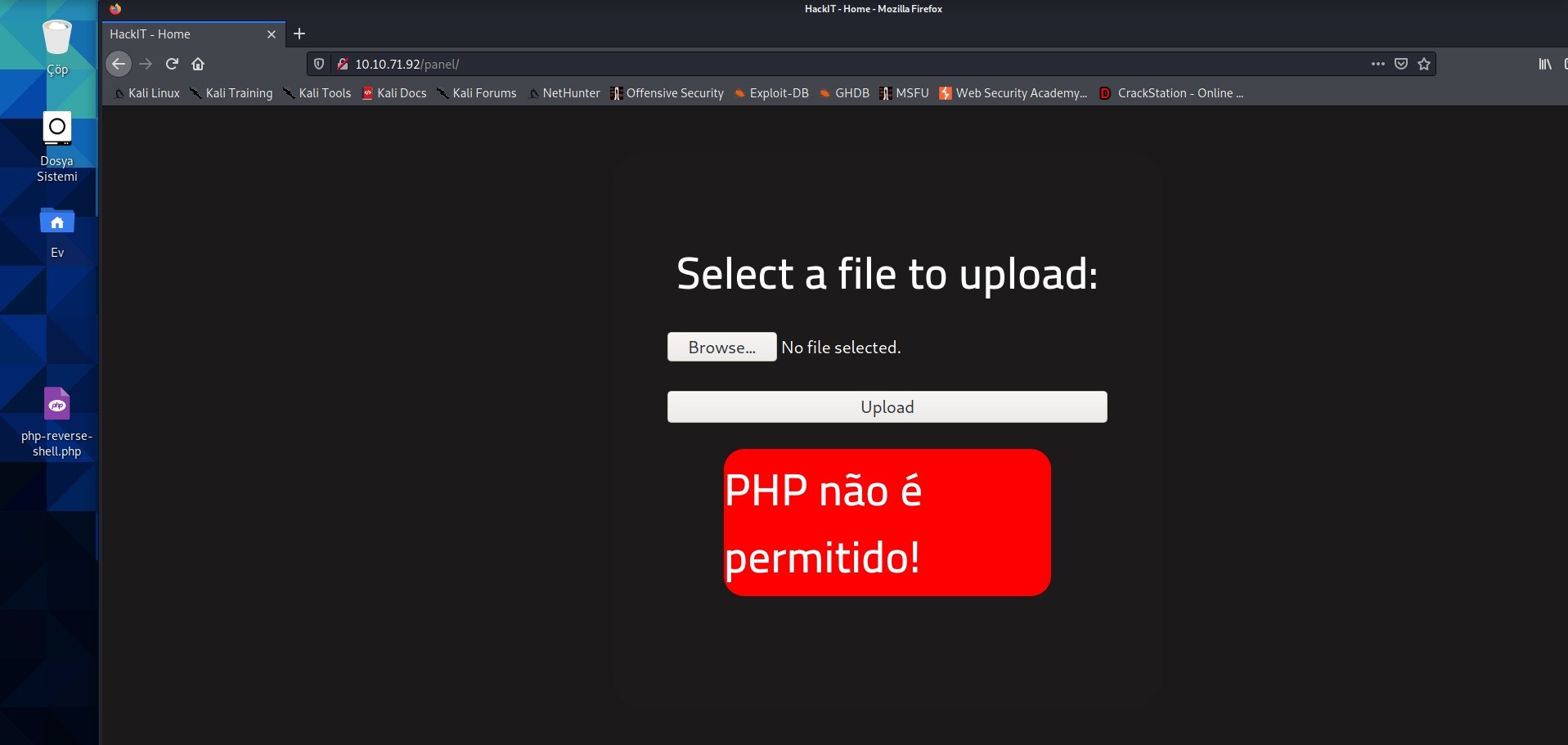 10.10.71.82/panel sayfasında dosya yükleme paneli bulunuyor. 10.10.71.82/index.php sayfası açıldığı için sayfanın php ile yazıldığı biliniyor. Php reverse shell komut dosyası kullanılarak bağlantı sağlanılabilir. Bunun için pentest monkey’in php reverse shell kodunu kullandım. Dosya yüklenmek istendiğinde izin verilmiyor.