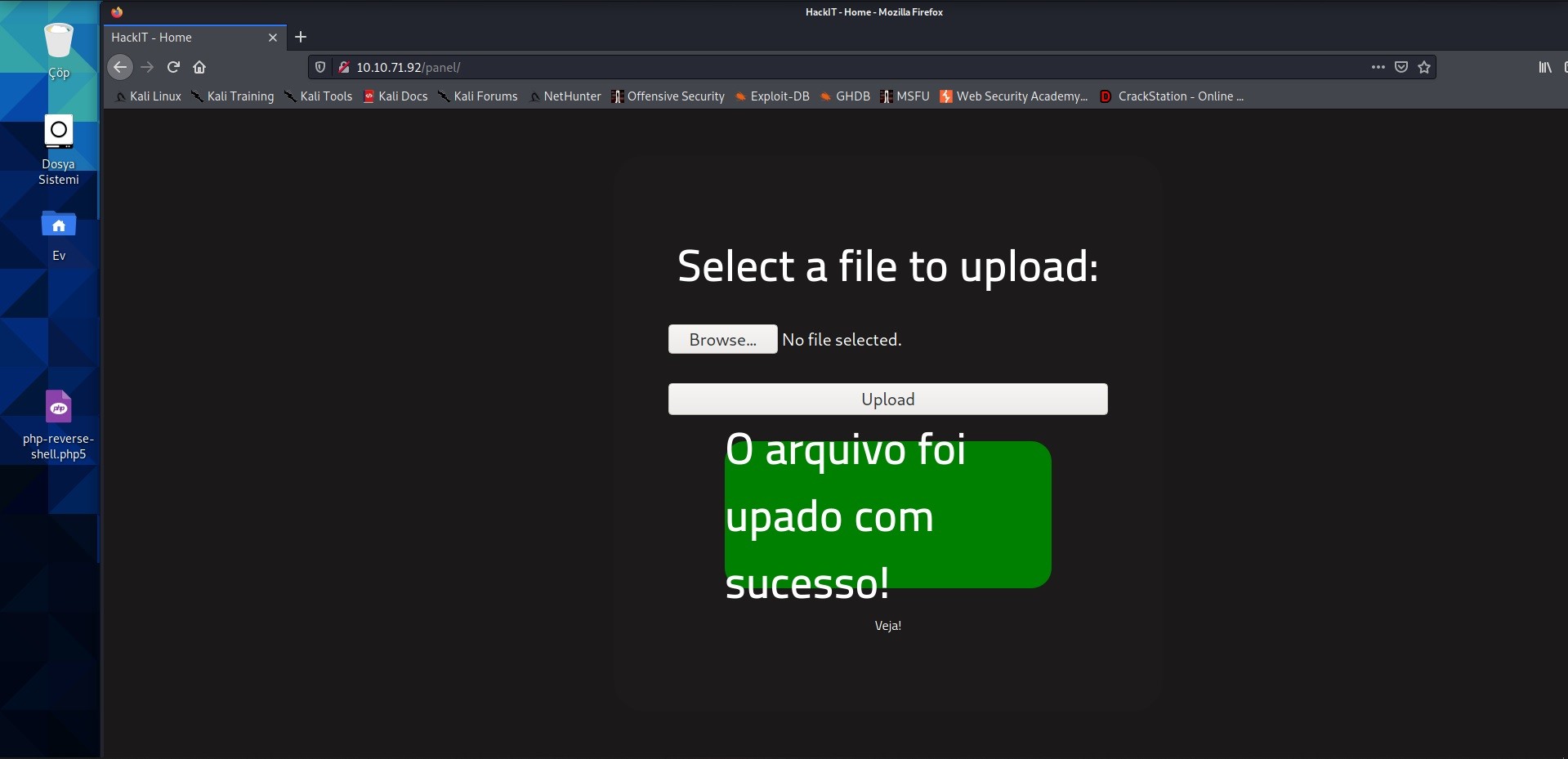 Dosya adı uzantısı değiştirilerek file upload bypass işlemi yapılabilir. Bu yüzden php-reverse-shell.php dosyasının adı php-reverse-shell.php5 yapıldığında yükleme işlemi başarı ile gerçekleşiyor.