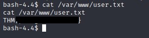 cat /var/www/user.txt ile user flag’ı görüntülenir.