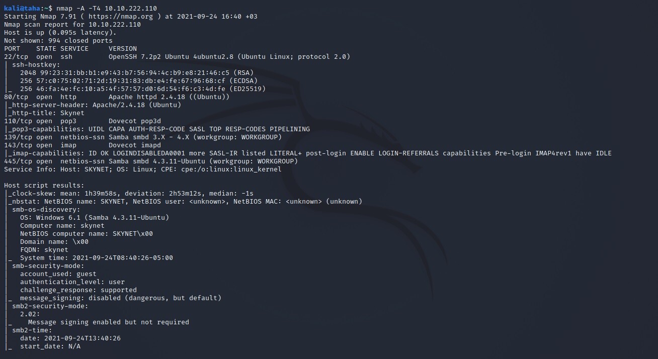 nmap -A -T4 10.10.222.110 ile nmap taraması yapıldığında ssh, http ve samba portunun açık olduğu görülmektedir.