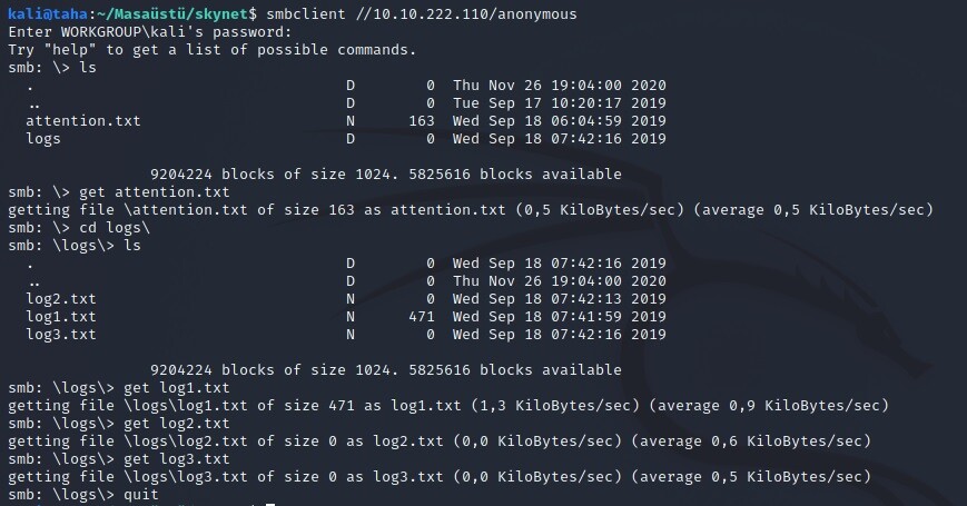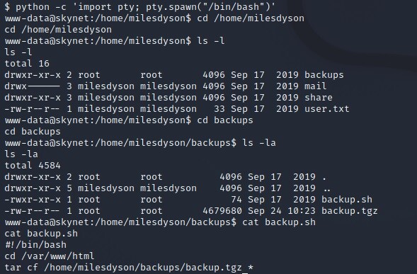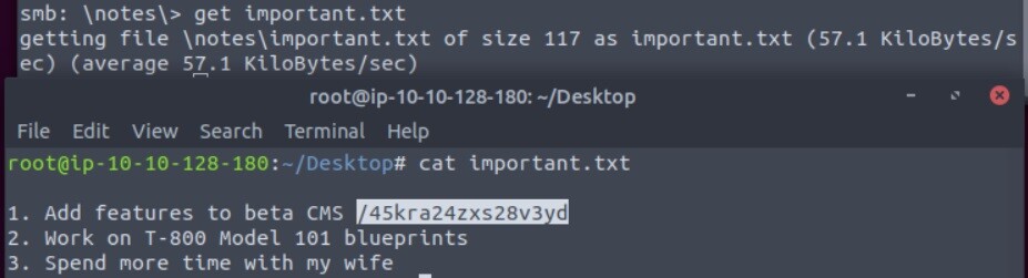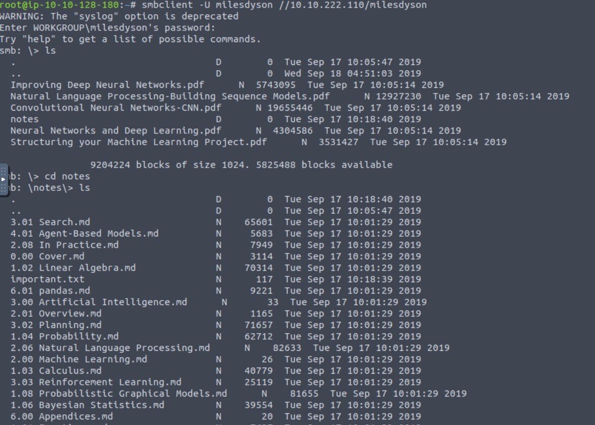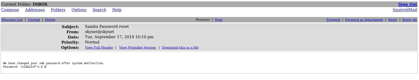 smbclient -U milesdyson //<ip>/milesdyson ile bu parolayı kullanarak giriş yapıldığında başarı ile bağlantı sağlandı.