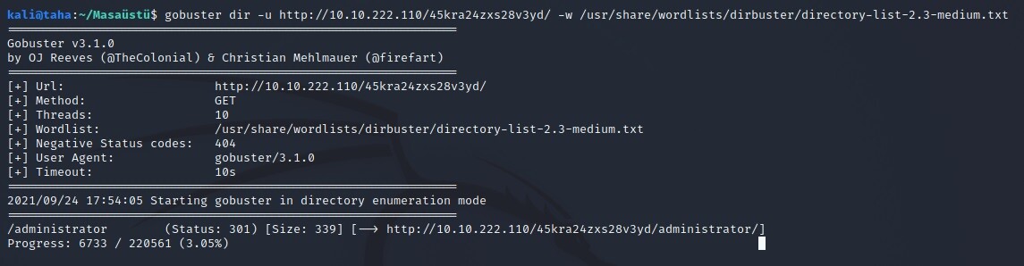 gobuster dir -u <ip>/45kra24zxs28v3yd -w <wordlist> ile bu sayfaya ait dizinler aratıldığında /administrator adlı dizin bulundu.