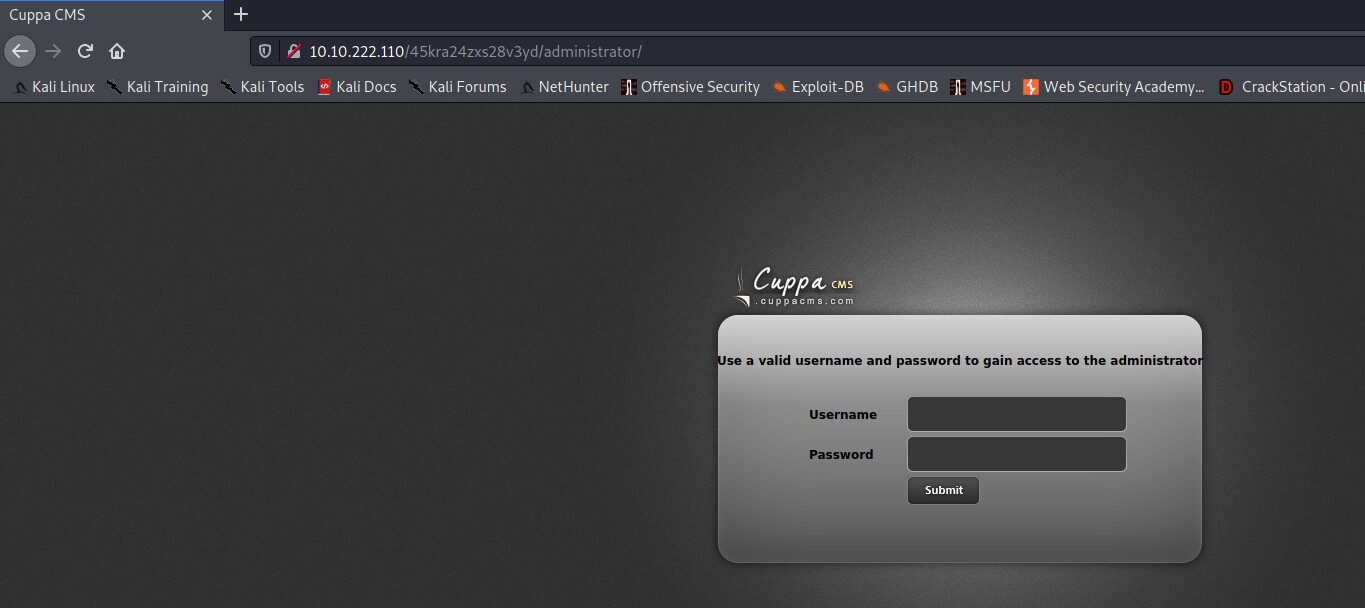 <ip>/45kra24zxs28v3yd/adminstrator sayfasına gidildiğinde cuppa cms giriş paneli bulundu.