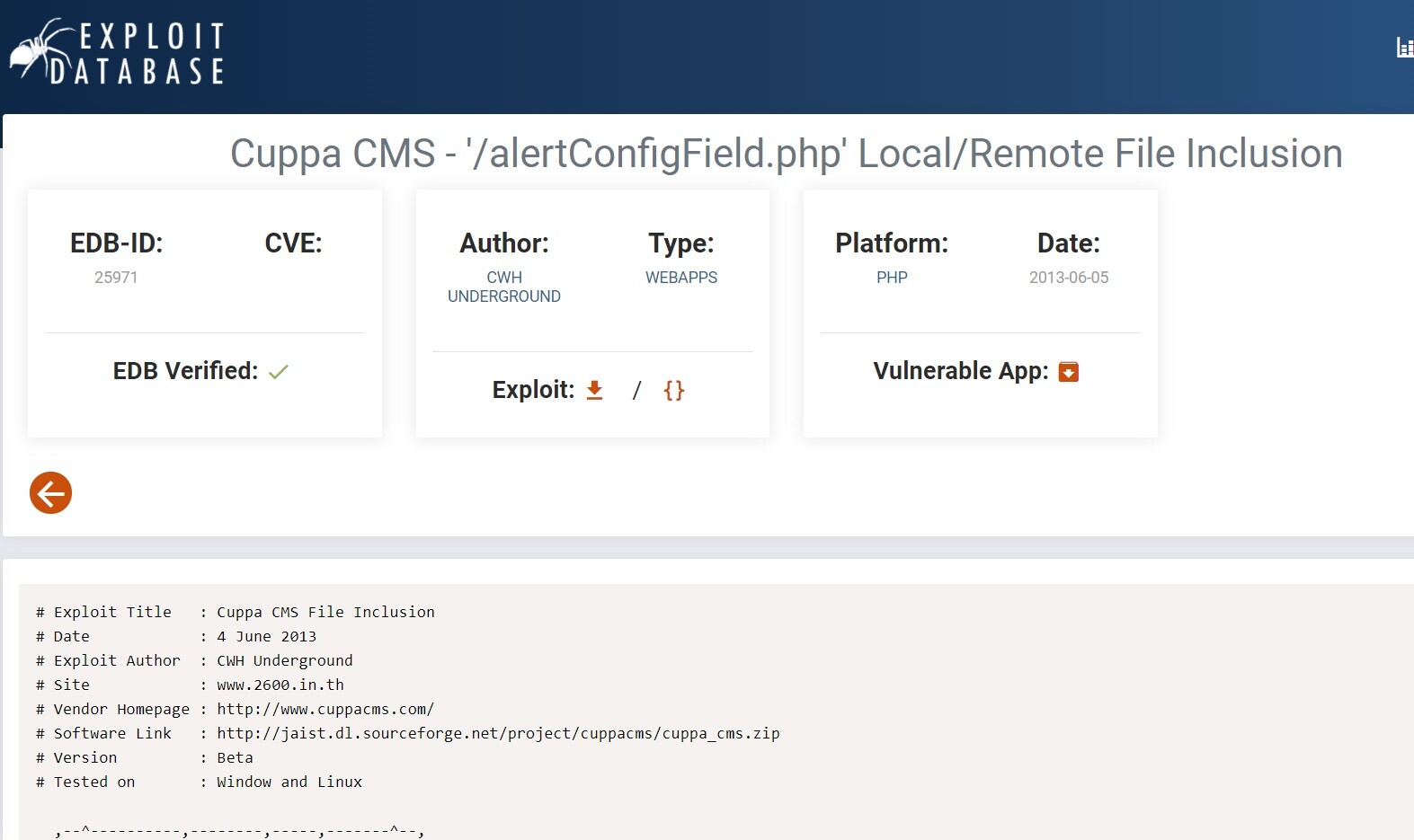 Cuppa CMS exploit database’de aratıldığında Cuppa CMS ile ilgili Remote File Inclusion bulunuyor.