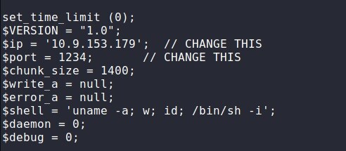 PentestMonkey’in php reverse shell’inde local ip ve dinleme yapılacak port kısımları düzenlenir.