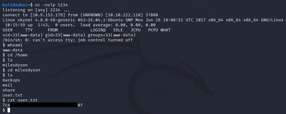 Netcat bağlantısı sağlandıktan sonra user flag’ı bulunmuş oldu.