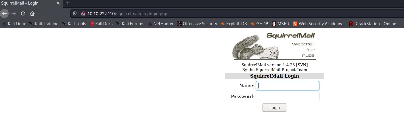 /squirrelmail adlı uzantıya gidildiğinde SquirrelMail adlı giriş paneli bulunmaktadır.
