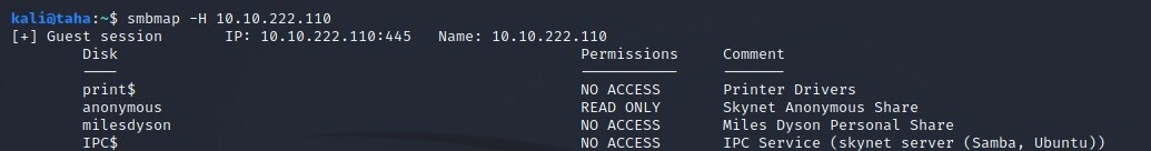 smbmap -H <ip> ile tarama yapıldığında anonymous adlı kullanıcının okuma izni olduğu görülüyor. Aynı zamanda milesdyson isimli başka bir kullanıcı da bulunmuştur.