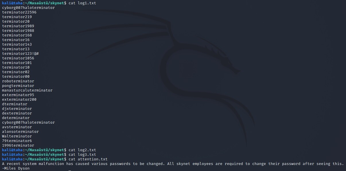 log1.txt adlı dosyaya bakıldığı zaman bir wordlist’e benzeyen bir metin belgesi bulunuyor.