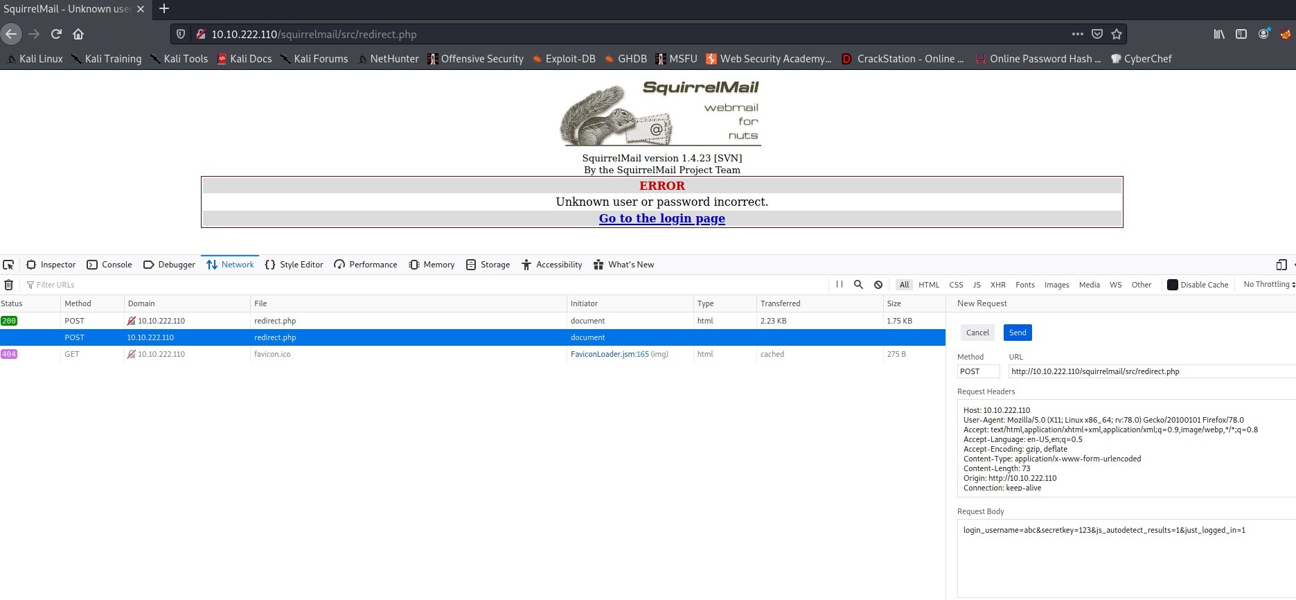 SquirrelMail paneline hatalı giriş denemesi yapılır. Inspect Element, network sekmesinde request isteği ve post metodu görülüyor. Edit and Resend denilerek daha detaylı olarak görüntülenir. Hackpark çözümümüzde benzer bir saldırıyı daha önce gerçekleştirmiştik. İsterseniz bu aşamayı Burp Suite aracıyla da gerçekleştirebilirsiniz.