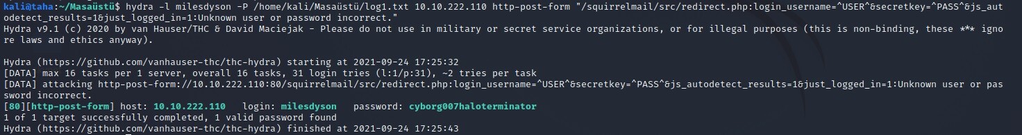 hydra -l milesdyson -P rockyou.txt $ip http-post-form “login page path: request body: error message” parametresiyle brute force gerçekleştirilir. Wordlist küçük olduğu için isterseniz bu aşamayı Burp Suite aracılığıyla da gerçekleştirilir. Burada dikkat edilmesi gereken request body kısmının username=^USER’&secretkey=^PASS’ şeklinde düzenlenmesidir. Parola “cyborg007haloterminator” olarak bulundu.