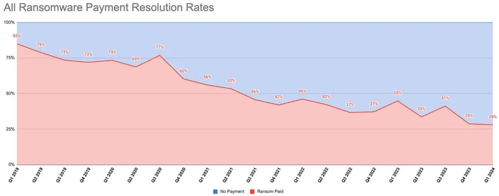 Fidye yazılımıyla uğraşan tehdit aktörleri bu senenin ilk çeyreğine zorlu bir giriş yaptı. Siber güvenlik firması olan Coveware’ın istatiklerine göre şirketlerin fidye taleplerini karşılamayı reddeden firmaların sayısında rekor artış görünüyor. Coveware’ın yaptığı araştırmalar sonucu ortaya çıkan tabloda 2024’ün ilk çeyreğinde fidye ödeyen şirketlerin oranının %28 gibi düşük bir seviyede olduğu görülüyor.
