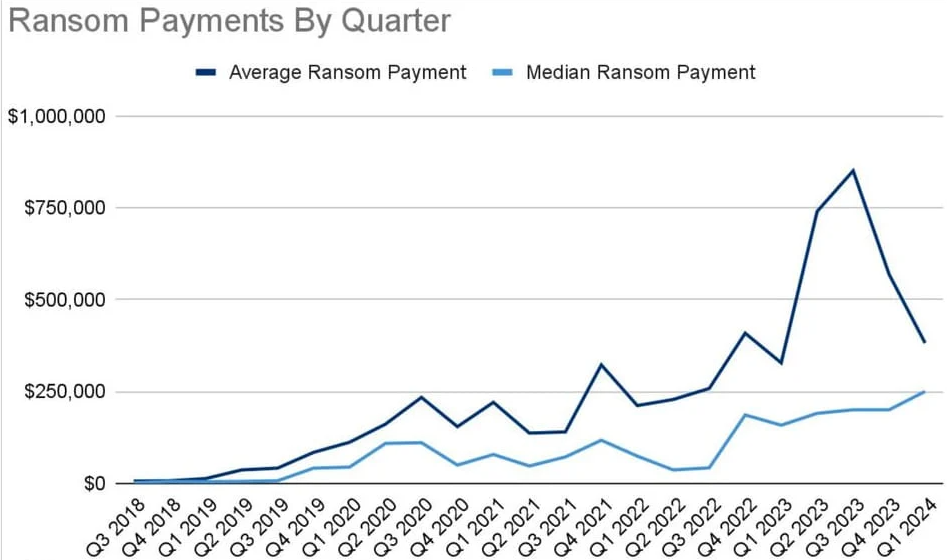 Coveware’ın sunduğu raporlara göre talep edilen ortalama fidye fiyatı önceki çeyreklere göre 2024’ün ilk çeyreği için %32 düşerek 381,980 dolar fiyatına gerilemiş fakat medyan ödenen fidye %25 artarak 250,000 dolar miktarına çıkmıştır.
