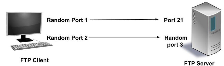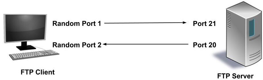 Aktif Mod: Bu modda, kullanıcı FTP istemcisi üzerindeki rastgele bir bağlantı noktasından (rasgele bağlantı noktası 1) sunucunun 21 numaralı bağlantı noktasına bağlanır. Sunucuya istemcinin hangi portuna bağlanması gerektiğini söyleyen “PORT” komutunu gönderir, yani (rastgele port 2). Sunucu, 20 numaralı bağlantı noktasından istemcinin belirlediği bağlantı noktasına, yani Rastgele Bağlantı Noktası 2’ye bağlanır. Bağlantı kurulduktan sonra, veri aktarımı bu istemci ve sunucu bağlantı noktası üzerinden gerçekleşir.