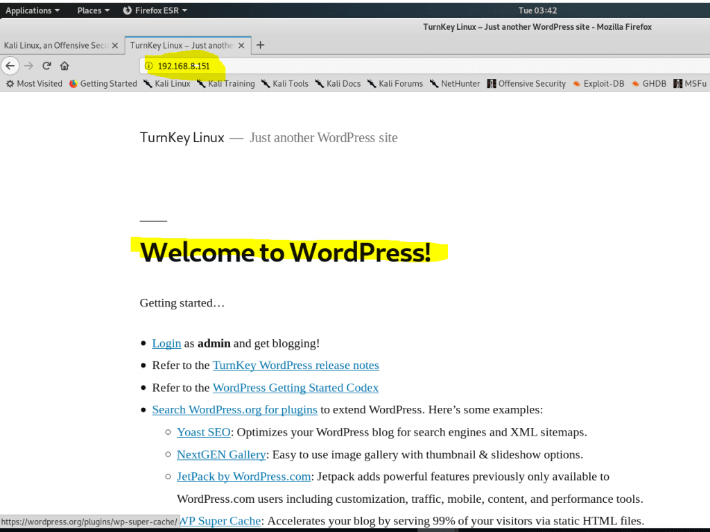 Kali’de Firefox tarayıcısına 192.168.8.151 adresini yazdığımızda WordPress sitemize ulaşabiliriz.