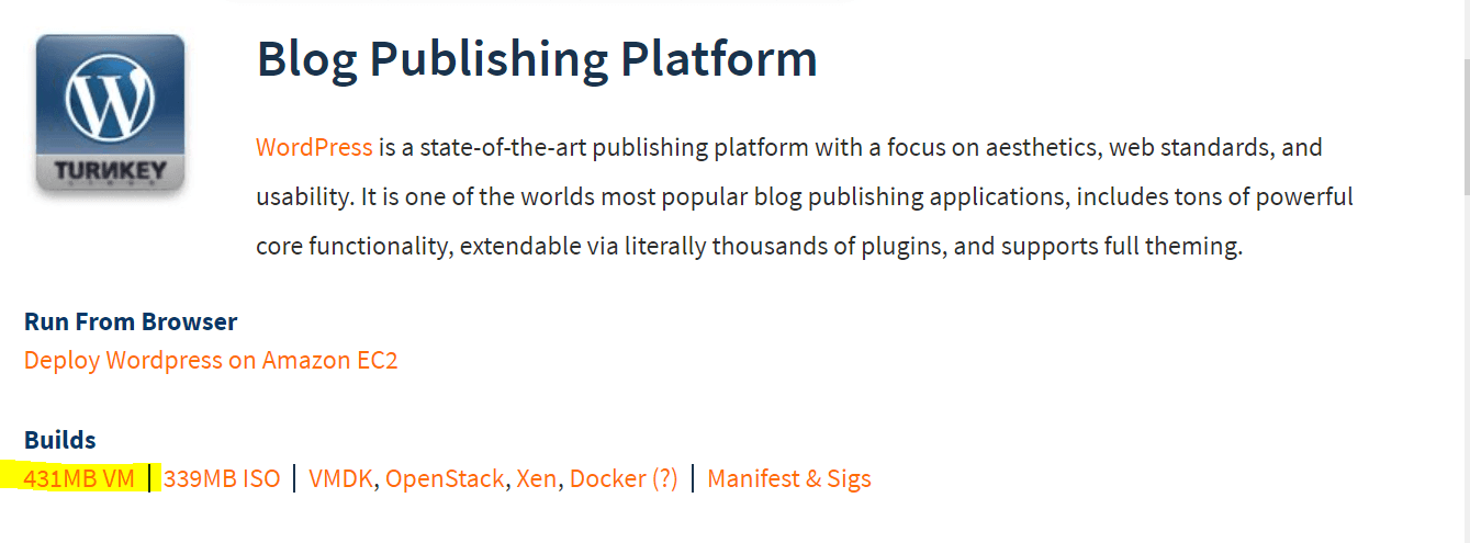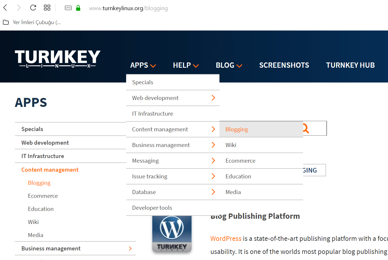 Bunun için önce https://www.turnkeylinux.org adresine gidiyoruz. Buradan Apps/Content Managent/Blogging menülerini izleyerek WordPress indirme sayfasına geliyoruz.