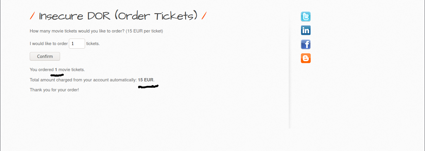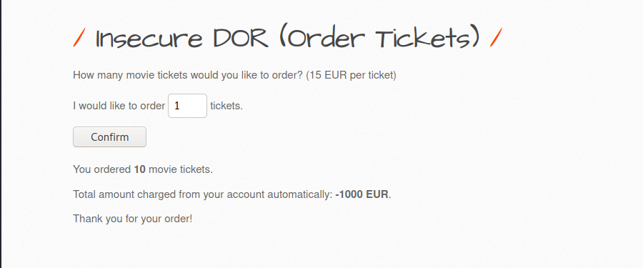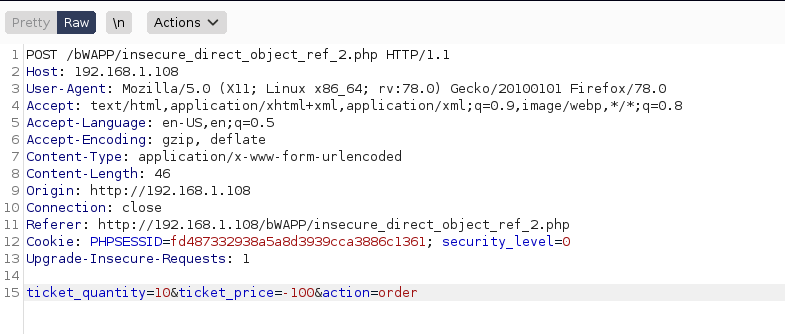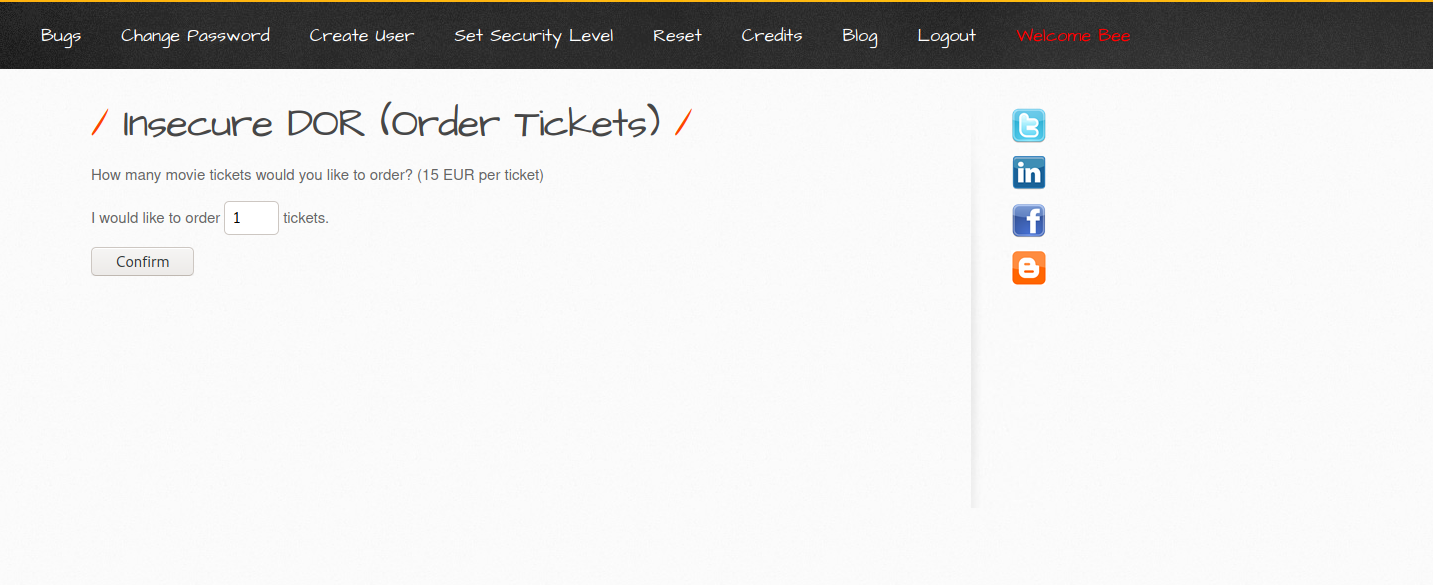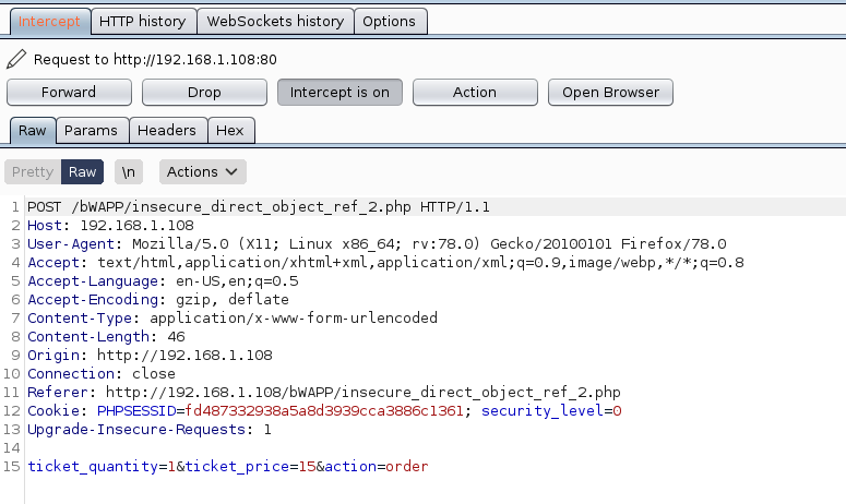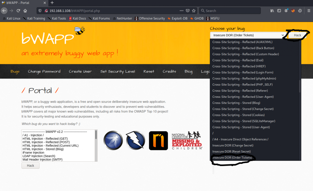 Öncelikle bwapp makinemi ve kali linux makinemi çalıştırıyorum ve tarayıcı üzerinden bwapp makinemin ip adresine gidiyorum.Kullanıcı olarak giriş yaptıktan sonra sağ üsteki seçim menüsünden “insecure dor (order ticket)” olan kısmı seçip “hack” butonuna basıyorum.