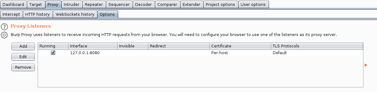 Burpsuite aracımızı açıyorum ve “proxy” kısmındaki “options” seçeneğindeki ip adresi ve port bilgisini kontrol ediyorum.
