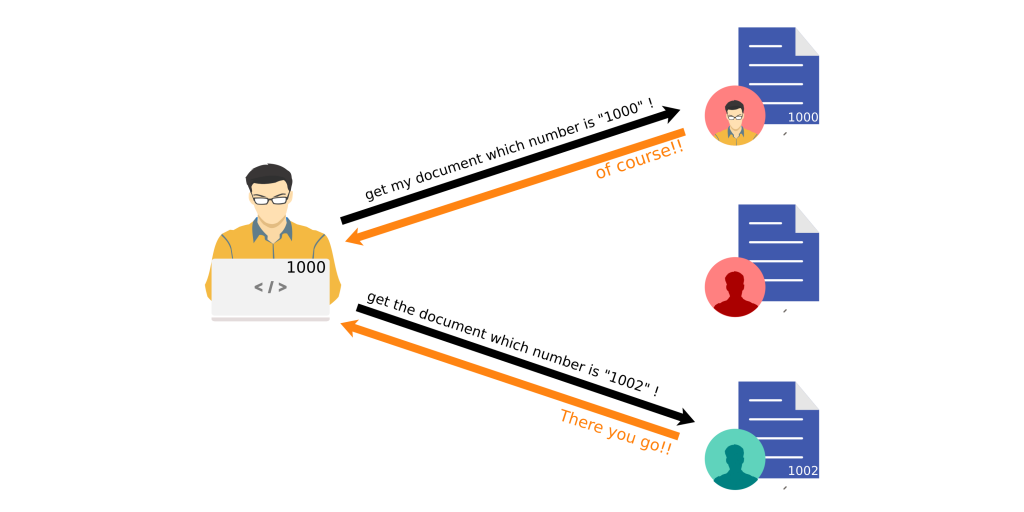 Resimde gördüğünüz gibi bir kişi var ve bu kişi “1000” ve “1002” numaralı dokümanları “1000” ve “1002” numaralı kullanıcılara gönderiyor yani doküman sahiplerinin her biri farklı kullanıcı id’sine sahip kişiler.Şimdi şunu düşünün sizin içinde kendi verinizin olduğu bir dokümanın yanlış bir kullanıcının eline geçmesi veya bir kullanıcının sizin göndereceğiniz verileri değiştirmesi ne kadar kötü olurdu değilmi işte idor zafiyeti olan bir sistemde ortada gördüğümüz kırmızı profildeki şahıs 1000 ve 1002 kullanıcısında giden requesti değiştirip onların yerine onların kullanıcı id’si ile sisteme girip o bilgilere sahip olabilir yada kullanıcılardan giden belgeleri istekleri değiştirip oldukça kötü sonuçlara yol açabilir o nedenle bulunması oldukça zor ve var olan sistemde karmaşalara yol açabilecek bir o kadar da tehlikeli bir zafiyet türüdür.