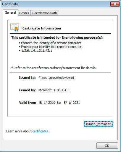 Daha inandırıcı hale getirmek için, Azure’da barındırılan kimlik avı sayfaları, aşağıda gösterildiği gibi Microsoft’tan bir sertifika kullanılarak korunur.