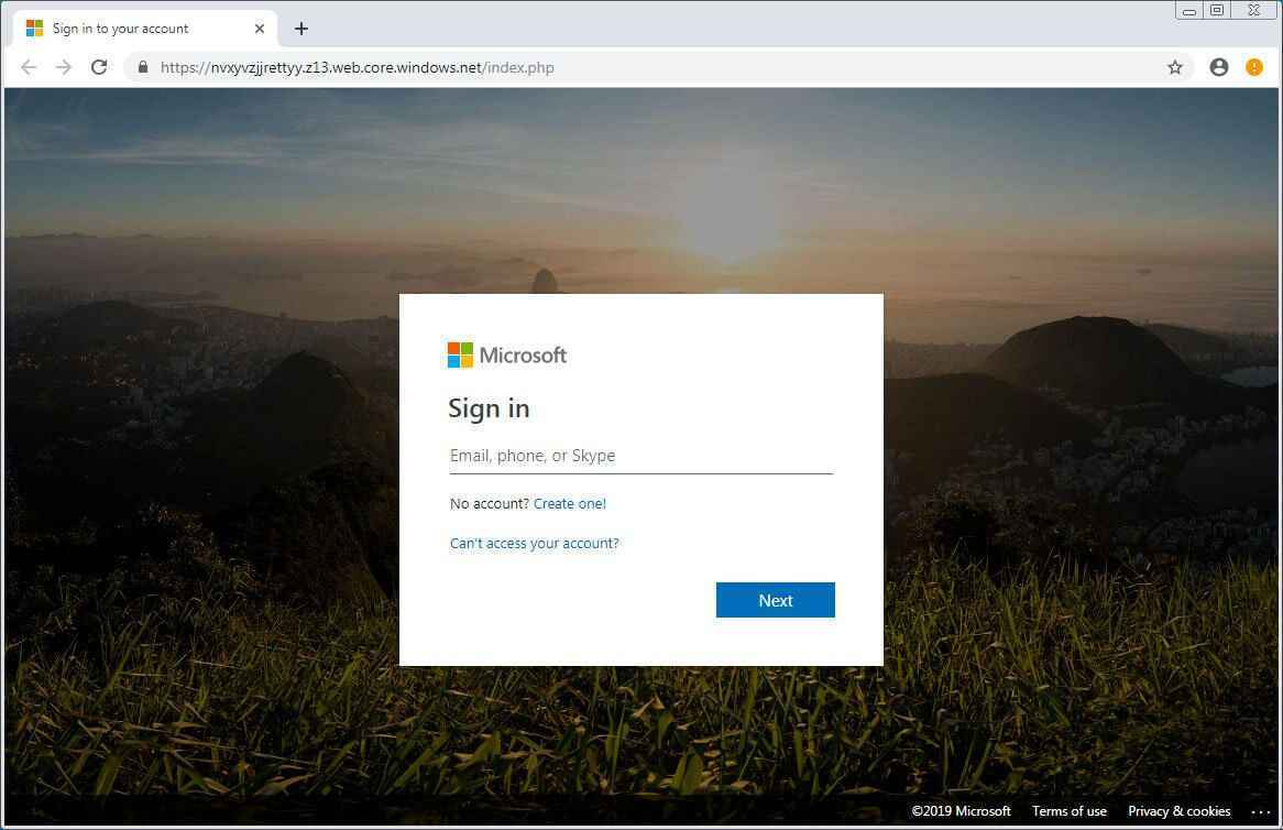 Örneğin, yukarıdaki e-postadaki “Araştır” bağlantısı, Azure’daki windows.net etki alanında barındırılan sahte bir Microsoft giriş sayfasına yol açacaktır. Azure ve bir windows.net alanını kullanmak, giriş bilgisine daha fazla meşruiyet kazandırır.