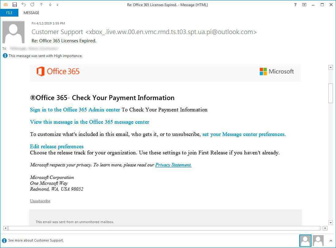 BleepingComputer tarafından bulunan sahte bir uyarı örneği, bir kuruluşun Office 365 lisanslarının süresinin dolduğunu belirten bir örnektir. Posta daha sonra, kullanıcının ödeme bilgilerini kontrol etmek için Office 365 Yönetici Merkezi’ne giriş yapmasını söylemeye devam eder.