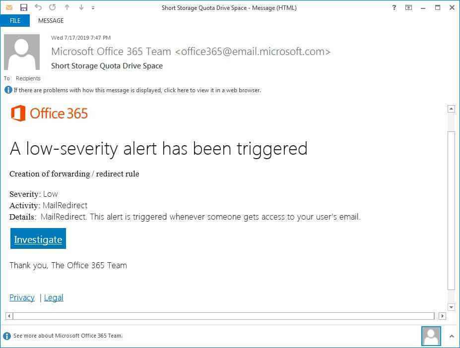 Bir yöneticinin hesabına erişmek için, kimlik avcıları Office 365 yönetici uyarılarıyla gizlenmiş kampanyalar oluşturmaya başladı. Bu uyarılar tipik olarak, yöneticilerin posta hizmetiyle ilgili bir sorun veya keşfedilen yetkisiz erişim keşfi gibi acil bir ilgiyi gerektiren zamana duyarlı bir sorunla ilgili olacaktır.