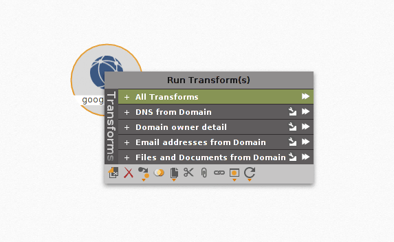 Paterva.com olan varsayılan domaini değiştirmek için seçip F2 tuşuna basıyoruz ve google.com yazıyoruz. Sonrasında nesnenin üzerindeyken sağ tıklayarak açılan menüde All Transforms seçeneğinin yanındaki ok tuşuna tıklıyoruz.
