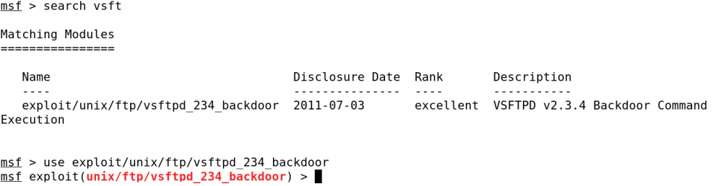 use komutu ile istenilen exploit ya da payload seçilmiş olur. Şekilde  ileride kullanımını göreceğimiz VSFTPD Backdoor exploitinin aranıp  ardından seçilmesi gösterilmiştir.
