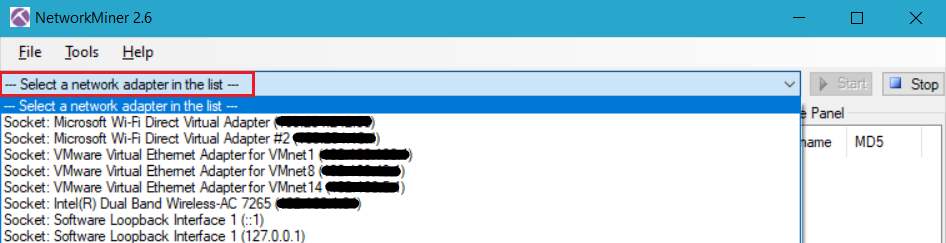 Canlı analiz için — Select a network adapter in the list — bölümünden izlemek istediğimiz network adaptörü seçilebilip Start ile canlı analize başlanılabilir.