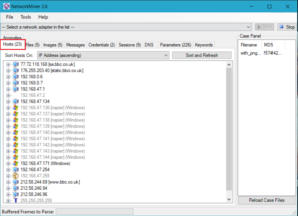 Hosts sekmesinde analiz edilen trafikteki tüm IP adreslerinin bir listesini vermektedir.