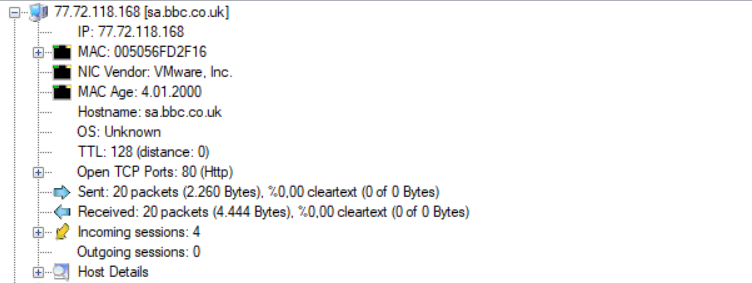Ip adreslerinin başındaki + işaretine tıkladığımızda biraz daha detay alabiliriz. Burada MAC adresi, host adresi, gönderilen ve alınan paketlerin boyutu, hangi portlar üzerinden iletişim kurduğu, işletim sistemi bilgileri vs.. gibi bilgilere ulaşabiliyoruz.
