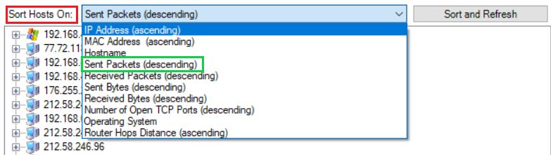 Sort Host On kısmında ise adresleri çeşitli parametrelere göre sıralayabilirsiniz. Örneğin “Sent Packets (descending)” seçersek adreslerdeki gönderilen paket boyutunu çoktan aza doğru sıralar.