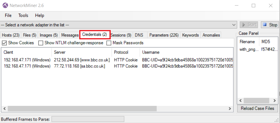 Credentials kimlik bilgileri sekmesi, kullanıcı adları ve parolalar gibi bilgiler barındırabilir bunun yanında trafikte yer alan HTTP,FTP çerezleri (cookie), NTLM challenge-response mesajları da barındırabilir.