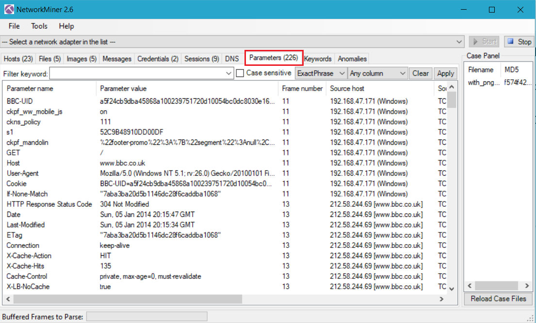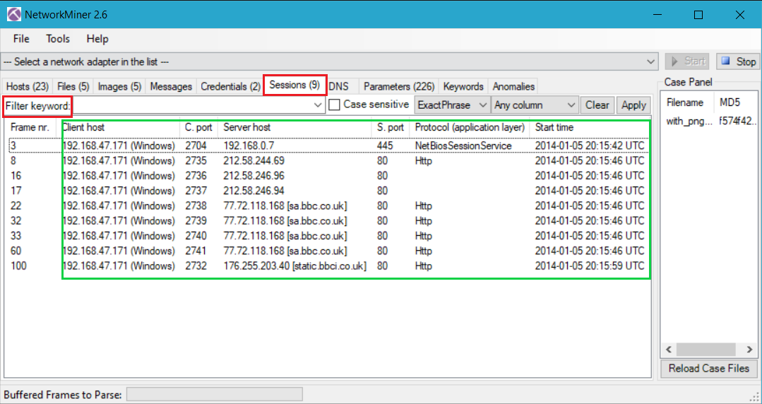 Örnek olması açısından bir pcap dosyasını inceleyelim aynı zamanda da Host,Files,Images,Messanges,Credentials,Sessions,DNS,Parameters,Keywords sekmelerinin görevlerini açıklayalım.