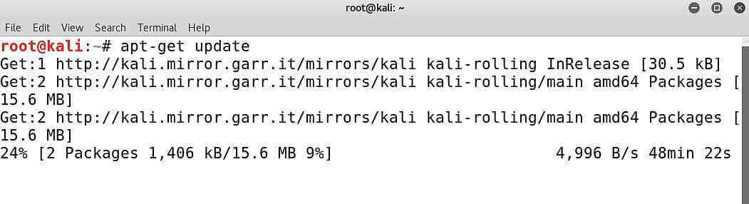 Nessus bir kısmı ücretsiz olan bir program, OpenVAS ise tamamen ücretsiz bir zafiyet analiz yazılımıdır. Kali ile kurulu gelmez. Hemen terminali açıp kuruluma başlayalım. Bunun için öncelikle apt-get update komutunu kullanıyoruz.