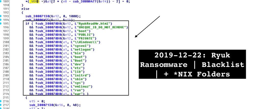 V2.exe örneğini analiz edildikten sonra güvenlik araştırmacısı Vitali Kremez fidye yazılımında ilginç bir değişiklik farketti ve paylaştı: Ryuk artık * NIX işletim sistemleriyle ilişkili klasörleri şifrelememektedir.