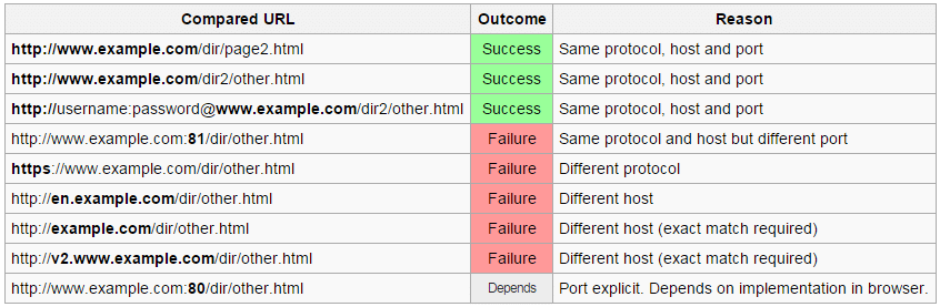 Neredeyse tüm browserlarda geçerli olan Same Origin Policy ile web kaynakları, döküman içeriklerine ve özelliklerine yalnızca aynı protokol, aynı domain ve aynı porta sahip oldukları zaman erişim sağlayabilirler.