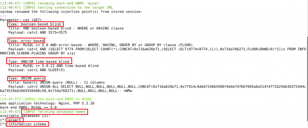 Burada -u parametresi ile hedef sitenin URL adresini, –dbs parametresi ile de SQL zafiyeti varsa mevcut veri tabanlarını listelemesini belirliyoruz. Birkaç defa sorulan sorulara Y tuşuna basarak geçiyoruz. Ve sonuçlara baktığımızda 4 farklı SQL injection tipinde zafiyet, iki tane de acuart ve information_schema isimli veri tabanı bulundu.