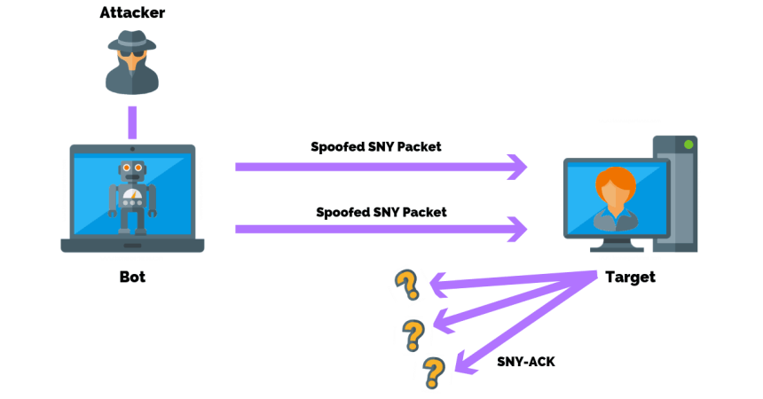 Bu saldırı türünde, saldırganlar birçok sahte SYN paketi göndererek hedef sistemde TCP bağlantılarının kurulmasını engellerler. Saldırganlar, SYN paketini gönderdikten sonra hedef sistemden bir yanıt beklerler. Fakat saldırının amacı bağlantı kurmak değil, hedef sistemde kaynak tükenmesi yaratmaktır. Saldırganlar, hedef sistemdeki kaynakları tüketmek için büyük miktarda sahte SYN paketi göndererek sunucunun kaynaklarını kullanılamaz hale getirirler.
