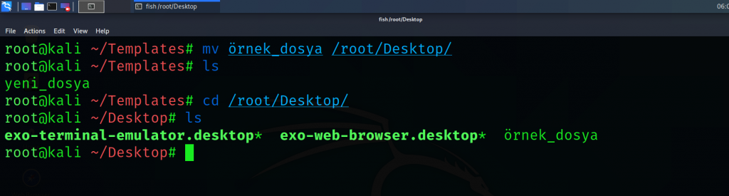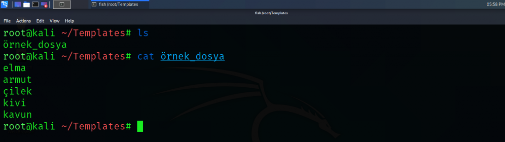 Not: cat komutunun uygulamalı olarak gösterilebilmesi için önceden oluşturulan ve boş olan örnek_dosya içerisine yazılar yazılmıştır.