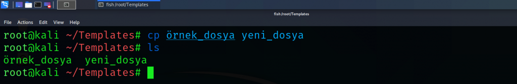 7) cp (copy): Dosyaları kopyalamak için kullanılır. Temel kullanımı “cp <eski_dosya_ismi> <yeni_dosya_ismi> “ şeklindedir. Dizin kopyalanmak istenirse “-r” parametresi kullanılmalıdır. Ayrıca dosya ve dizinleri bulunduğumuz dizinden farklı dizinlere kopyalamak da mümkündür.