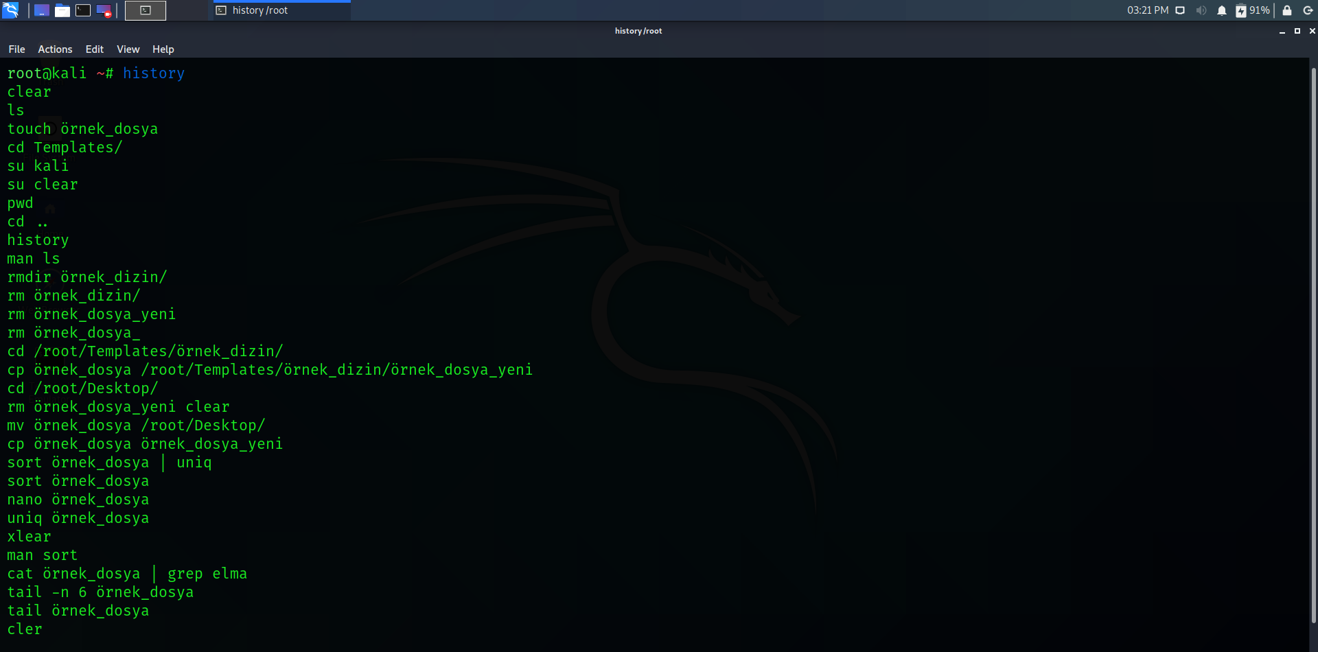 1) history : Daha önce kullanılmış olan bin komutu terminal ekranında listeler. Kullanım için terminal ekranına “history” yazılması yeterlidir. Açılan ekrandan çıkmak için “q” tuşu kullanılır.